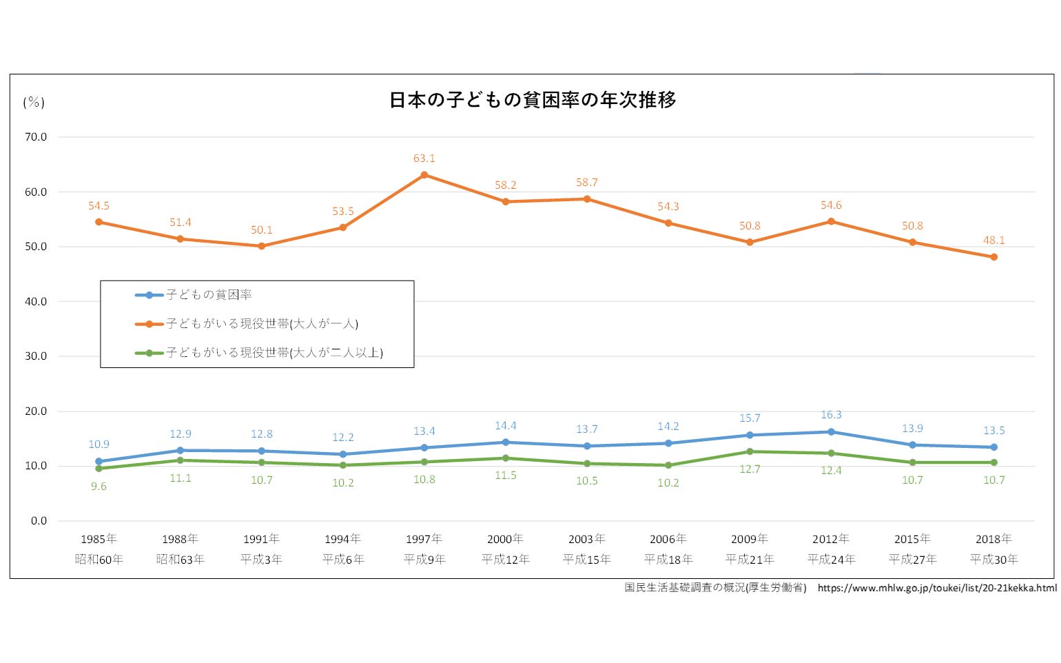 大人が一人の子どもがいる現役世帯(ひとり親世帯)では、貧困率は、子どもの貧困率の4倍程度の50%台となっており、2世帯のうち1世帯が貧困状態にあることが伺えます。